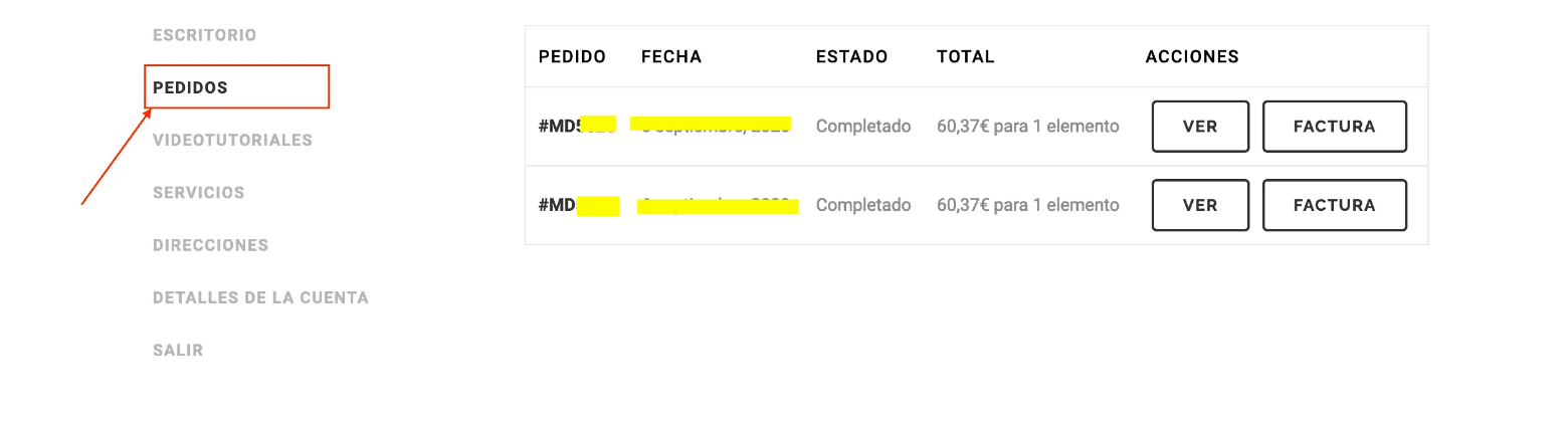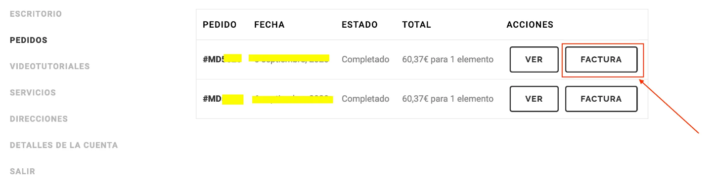 4. Descargar la factura que necesite pulsando el botón FACTURA. También puede consultar el pedido pulsando el botón PEDIDO.